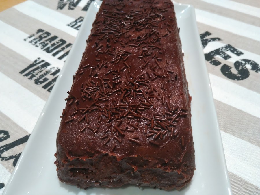- Por último añadimos el bizcocho olvidado a trocitos, mezclamos y volcamos en un molde de plum cake, previamente cubierto con papel film.