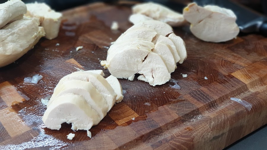 Una vez terminado, colamos el caldo y sacamos las pechugas. Loncheamos media pechuga para cada cuenco. (el resto yo lo suelo dejar en la nevera y usarlo para una sopa con pasta o para un salteado con arroz),