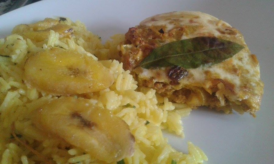 Mientras el plato se hornea, puede prepararse un arroz de acompañamiento y freír unas rodajas de plátano. En mi caso, he cocido arroz con un poco de cúrcuma y, después, le he añadido unas hojas picadas de perejil y hierbabuena.