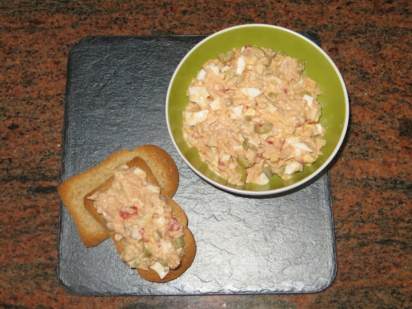 Elaboración:Picamos en trozos pequeños el huevo duro, las aceitunas y el pimiento. Escurrimos bien el atún y lo añadimos a la mezcla, luego echamos la mayonesa y el tomate frito damos varias vueltas y ya está listo para comer. Se puede acompañar del pan que más os guste y servirlo como aperitivo.