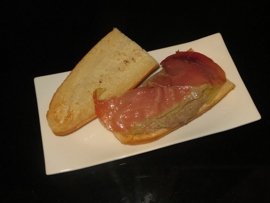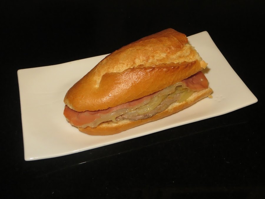 Ahora calentamos el pan en una plancha o tostadora y comenzamos a montar el bocadillo, si decidís utilizar mayonesa es el momento de untar el pan (yo no lo hice ya que el que probé en Valencia no llevaba mayonesa), colocamos el filete de ternera, la cebolla y por último el jamón, tapamos y ya está listo para comer.