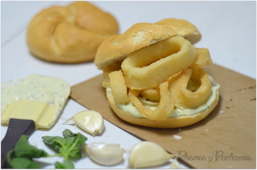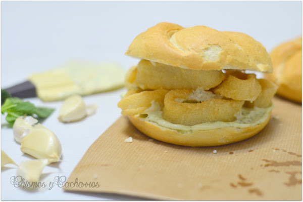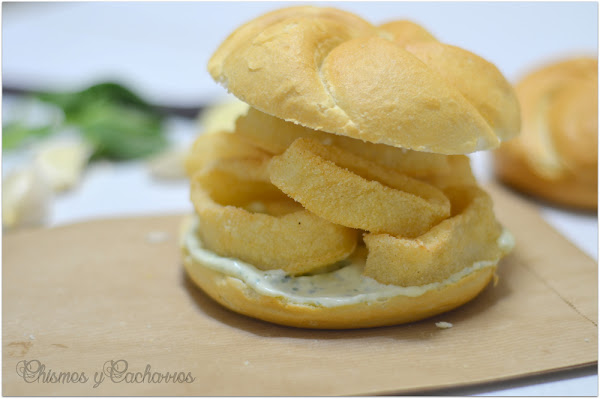 Abrir los panecillos a la mitad, untar la base con la mayonesa y colocar las anillas encima. Echar un poco de la mayonesa por encima y poner la otra tapa de pan. Listo.