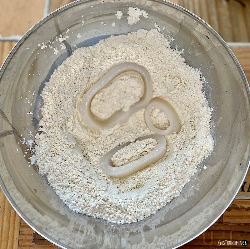 1. Una vez cortados, bien escurridos y secos nuestros calamares, añadimos sal al gusto.2. Mezclamos las dos harinas y enharinamos hasta que una capa cubra bien nuestros calamares. Es mejor hacerlo poco a poco, por tandas pequeñas, así no se nos forman pegotes.