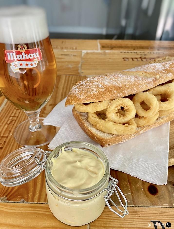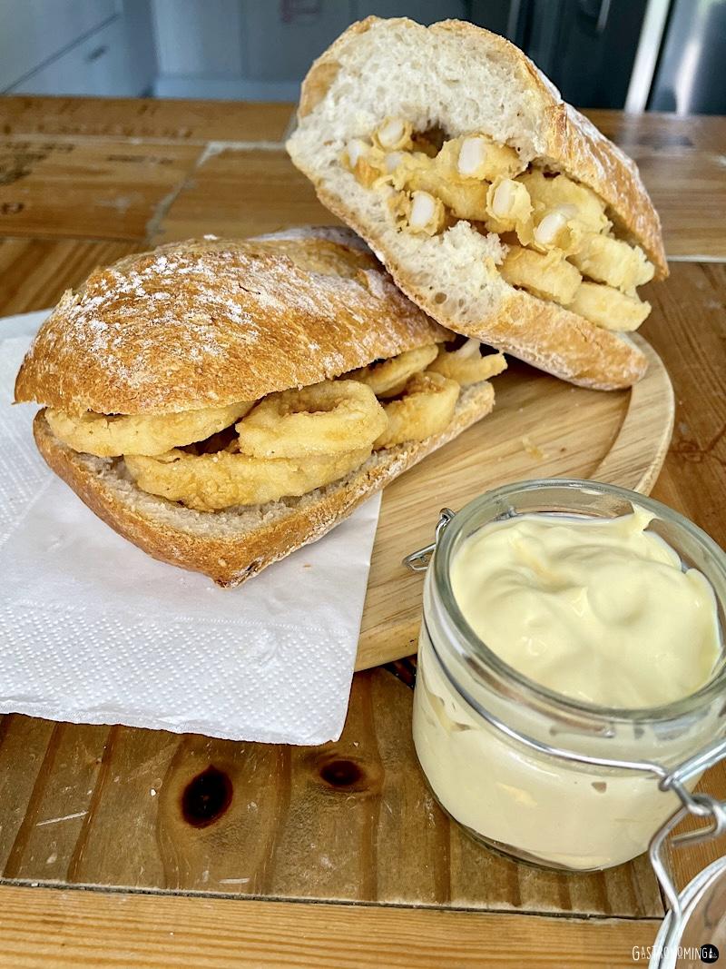 5. Cortamos el pan por la mitad y rellenamos con los calamares, servimos inmediatamente acompañando con mayonesa o alioli y una cerveza bien fría.
