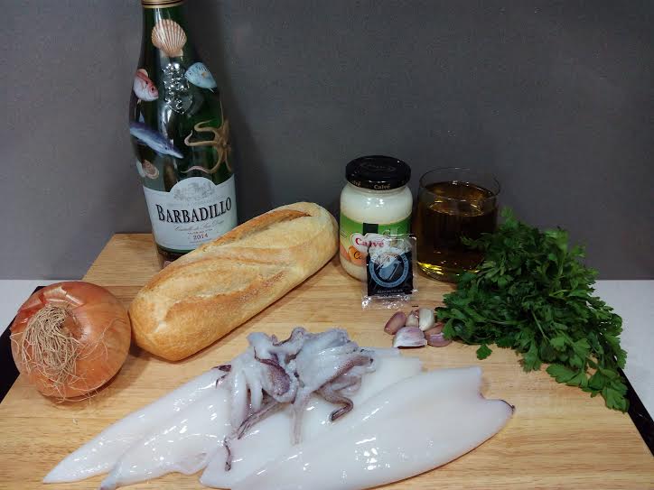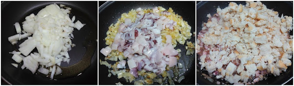 En una sartén, ponemos una cucharada de aceite y sofreímos la cebolla picadita. Cuando esté dorada añadimos las aletas y los tentáculos de los calamares y rehogamos todo junto. Picamos el pan y agregamos al sofrito. Cuando esté dorado vertemos el vino, cocinamos unos minutos todo junto y reservamos.