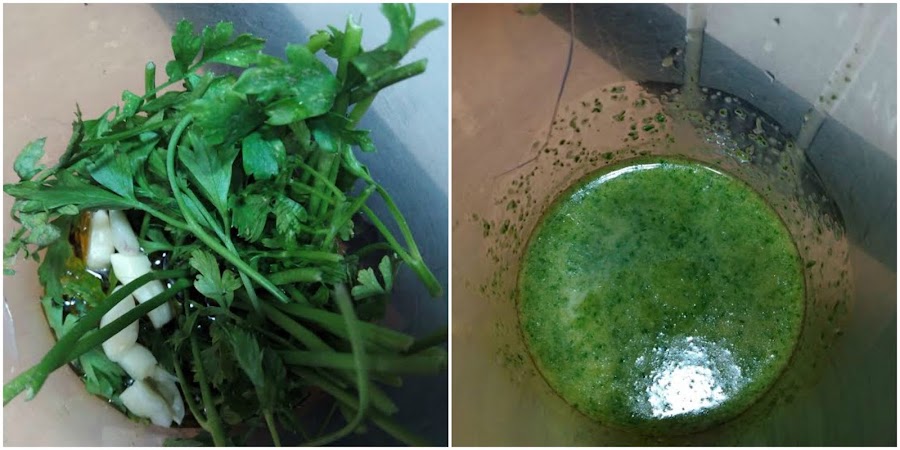 1 sobre tinta de calamarComenzamos preparando el aceite de ajo y perejil. Para ello, ponemos en el vaso de la batidora el aceite, los dientes de ajo y el perejil. Trituramos todo y reservamos.
