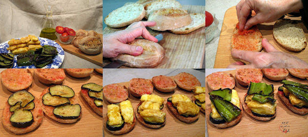 Colocar una capa de berenjenas, y sobre éstas dos o tres trozos de pescado, cubriendo la base del panecillo. Acabar con una capa de pimientos y cerrar el bocadillo con la otra mitad del pan.