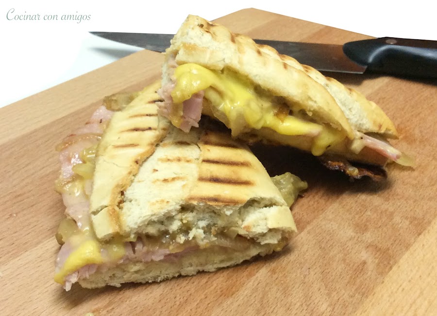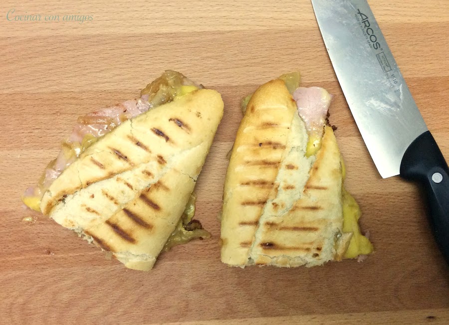 Echamos lacón, cubrimos con la cebolla caramelizada y una loncha de queso Edam, cerramos con el otro pan y tostamos en nuestra Princess 112412 - Panini grill.