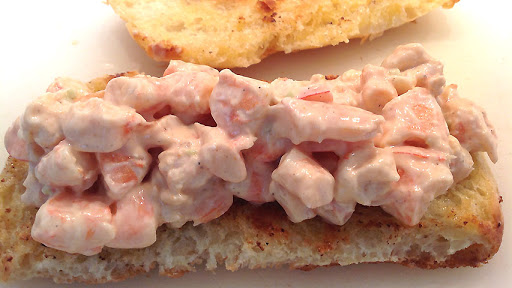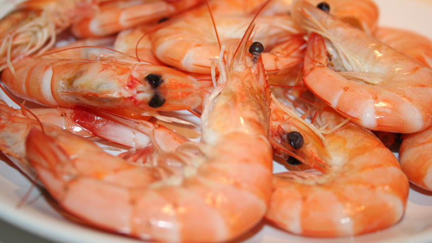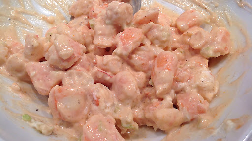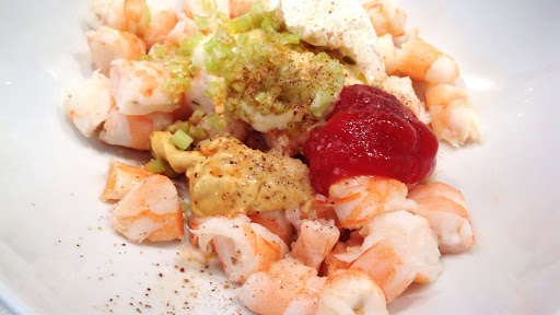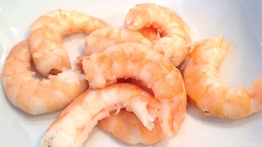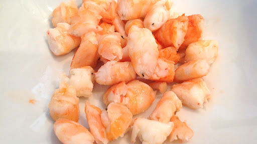 Pela los langostinos cocidos y trocea las colas poniendo los trozos en un bol.