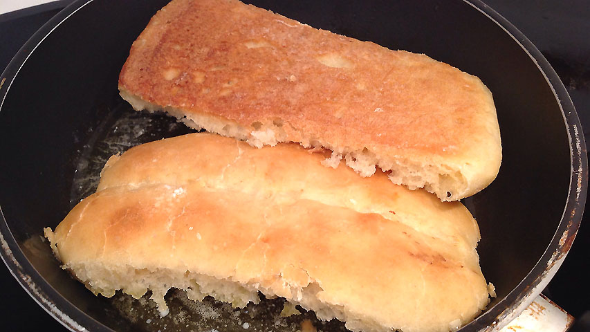 Abre el pan y ponlo a dorar en una sartén con mantequilla.