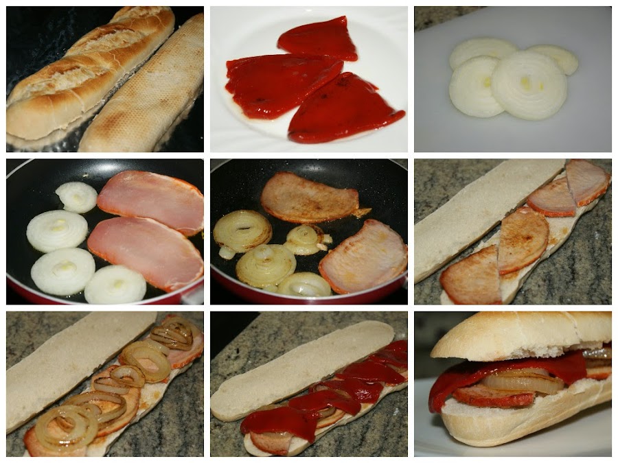 Disponer encima de la parte de abajo de la barra de pan el lomo cortado por la mitad, un poco de sal, encima colocar los aros de cebolla a la plancha y acabar con el pimiento a tiras y un poco más de sal. Tapar con la otra mitad y listo para disfrutarlo.