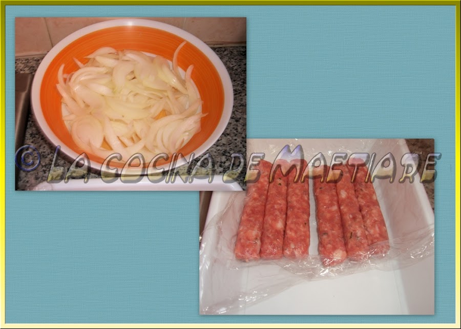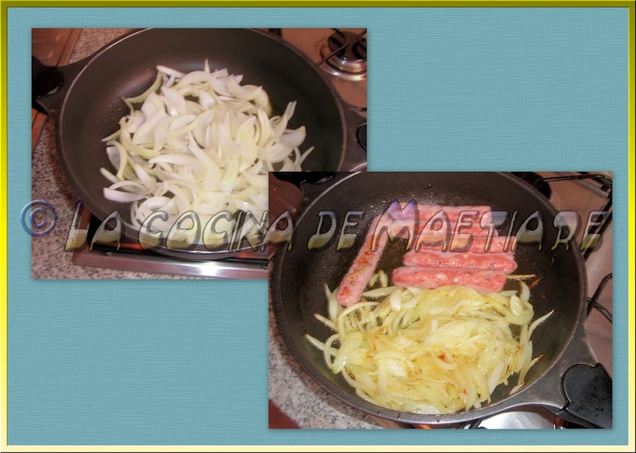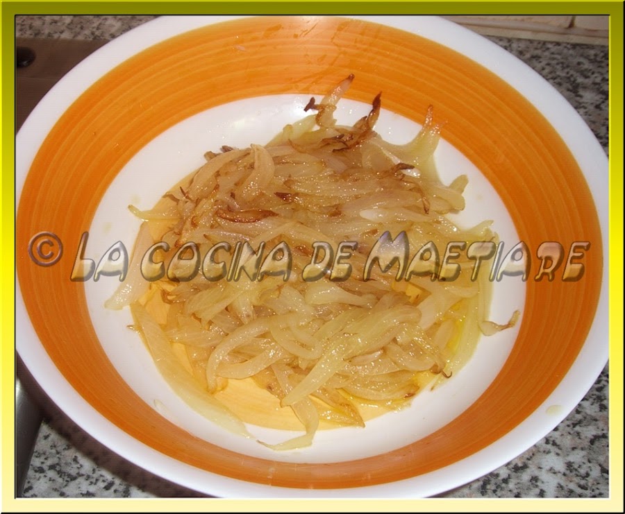 Cortar la cebolla en láminas. Sofreír en aceite de oliva ligeramente saladas hasta que comiencen a estar doradas.