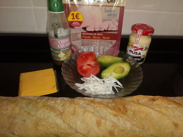 Abrís vuestro bocata de chapata y le untáis por ambos lados una capa generosa de mayonesa de chimichurri, luego colocáis el tomate, la cebolla, el aguacate, los tranchetes de queso cheddar y el fiambre de pavo y os lo lleváis a la plancha para darle varias vueltas y calentarlo un poco. Lo sacáis y ya lo tenéis listo para comer.