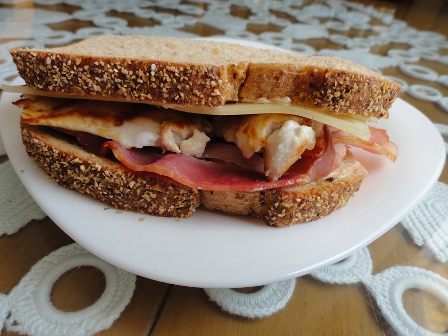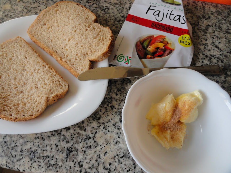 1 loncha de queso havartiHe mezclado la cucharadita de sazonador con la mantequilla y he untado dos rodajas de pan. He pasado por la plancha, sin agregar aceite las lonchas de bacon, En la misma plancha y sobre la grasita que suelta el bacon he hecho el filete de pollo. Colocamos las lonchas de bacon, el filete, y aprovechando que el filete esté caliente colocamos la loncha de queso. Y a comer!!! Muy rico, el pan buenísimo y el toque picantito del sazonador le va muy bien.