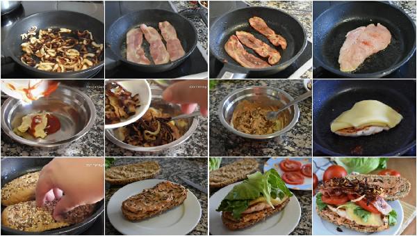 Untamos la base del pan con la salsa de mahonesa y cebolla, encima colocamos el pollo con el queso, sobre este unas hojas de lechuga, el tomate el rodajas y el bacon.
