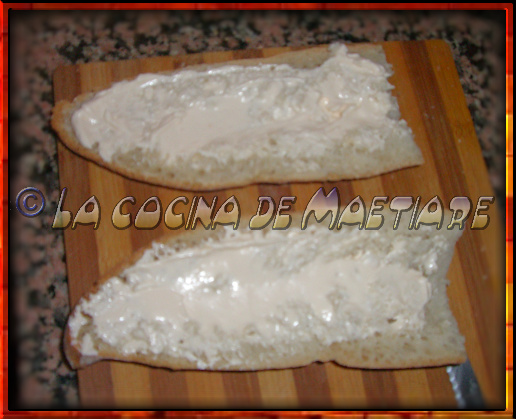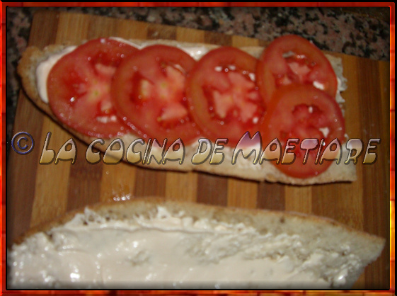 Cortar el pan por la mitad, untar ambas partes con un poco de veganesa