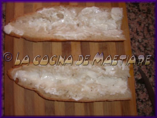 Abrir el pan por la mitad, en mi caso suelo eliminar un poco de la miga. Untar con allioli.