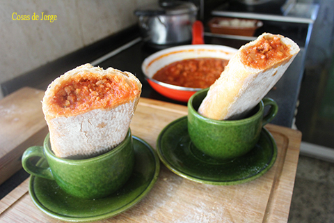 Rellenamos ambos bocadillos hasta arriba de salsa boloñesa y los colocamos en tazas o en algún otro recipiente similar que nos permita servir el bocadillo en vertical, como en la foto.