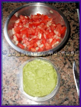 Trocear en cuadrados pequeños el tomate y la cebolla. Colocarlo en un bol y condimentar con sal y un poquito de aceite de oliva y mezclar bien para que se impregne bien del condimento.