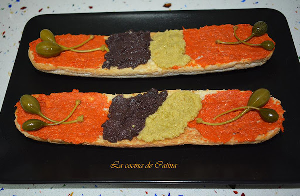 repartimos en las dos mitades de la baguette la sobrasada, alternando con los patés de aceitunas y colocamos por encima los alcaparrones.