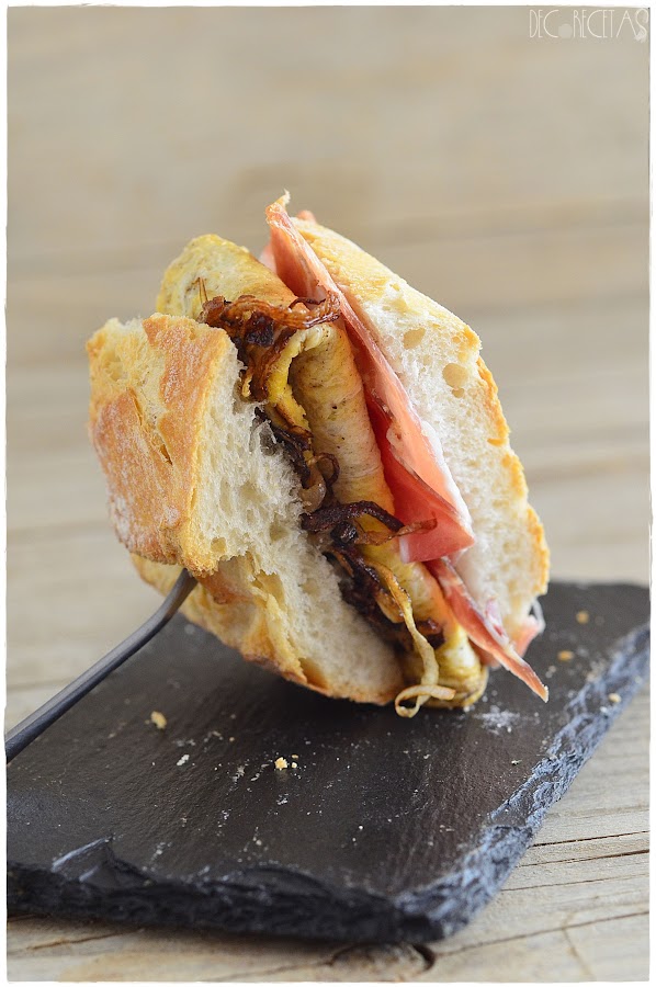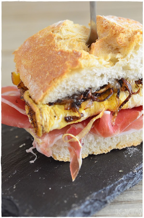 Lo que más complicación conlleva, es realizar una cebolla caramelizada, que tampoco tiene mucho misterio ya que simplemente la debemos de partir en juliana muy finita y ponerla a fuego bajo con una gota de aceite. Cuando esté a punto la disponemos encima de una tortilla francesa que habremos realizado previamente, y todo esto a su vez encima de una loncha de jamón serrano que dispondremos sobre un bollito de pan tostado untado en tomate rallado