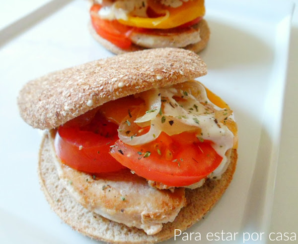- Montaremos el bocata poniendo entre las dos rebanadas de pan: un filete de pavo, rodajas de tomate, un poco de cebolla y de pimiento pochados, una cucharada de salsa mayonesa y espolvorearemos con orégano.