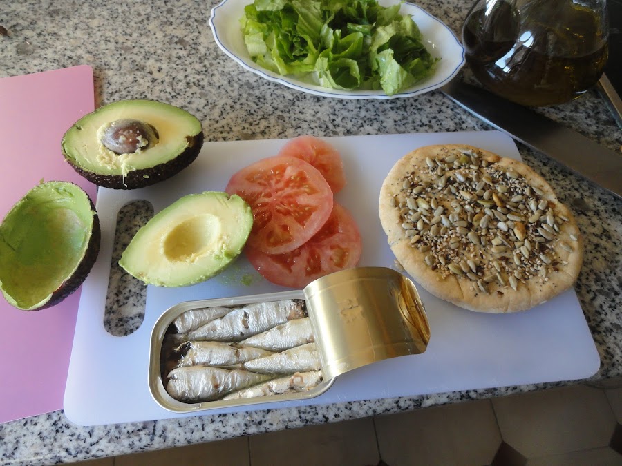 Ahora sólo se trata de ir colocando los ingredientes: las rodajas de tomate, las de aguacate, las hojas de lechuga y las sardinillas. Tapamos el bocata y a comerrrrrrr.