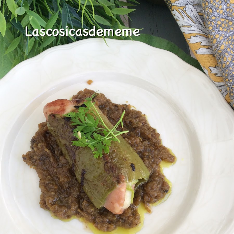 Ponemos sobre la mesa un trozo de papel film, colocamos un montoncitos de la carne, chafar bien y juntar, colocamos las lonchas de queso, con ayuda del papel lo enrollamos y metemos en cada mitad de pimiento, así todos los que vayamos a hacer...