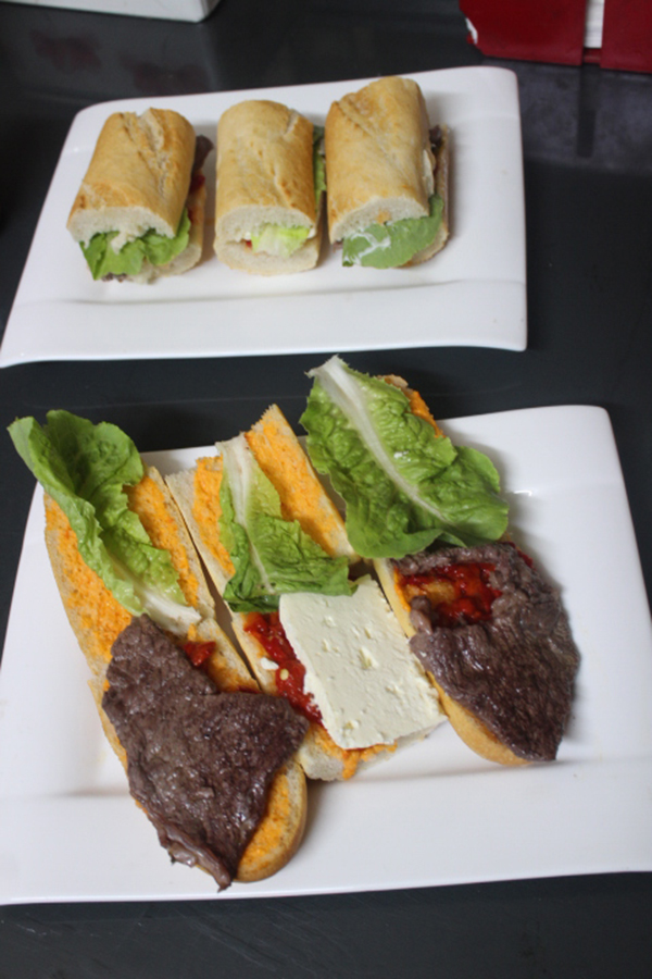 Partimos en dos cada filete de ternera y colocamos los cuatro trozos de ternera sobre 4 de los bocadillitos.
