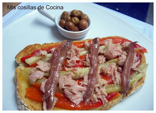 7. Sylvi del blog "Mis cosillas de cocina" me ha enviado (ya podría ser un táper) sus "Espardenyes con escalivada, atún y anchoas", me voy a pasado el día sobando anchoas a este paso!