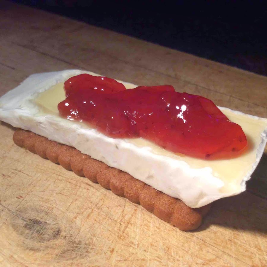 Nosotros hemos imitado el chesecake en crudo y la verdad es que la combinación es buenísima. En este caso hemos usado una galleta de canela en la base, un trozo de queso brie en el medio y mermelada de fresa encima.