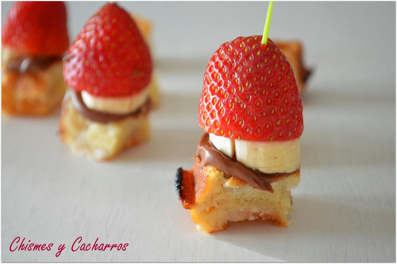 Pelar y cortar el plátano en rodajas no muy gruesas, lavar las fresas y quitar la parte del rabito. Con la ayuda de un palillo pinchar la rodaja de plátano y la fresa sobre el cuadrado con la nocilla. Servir.