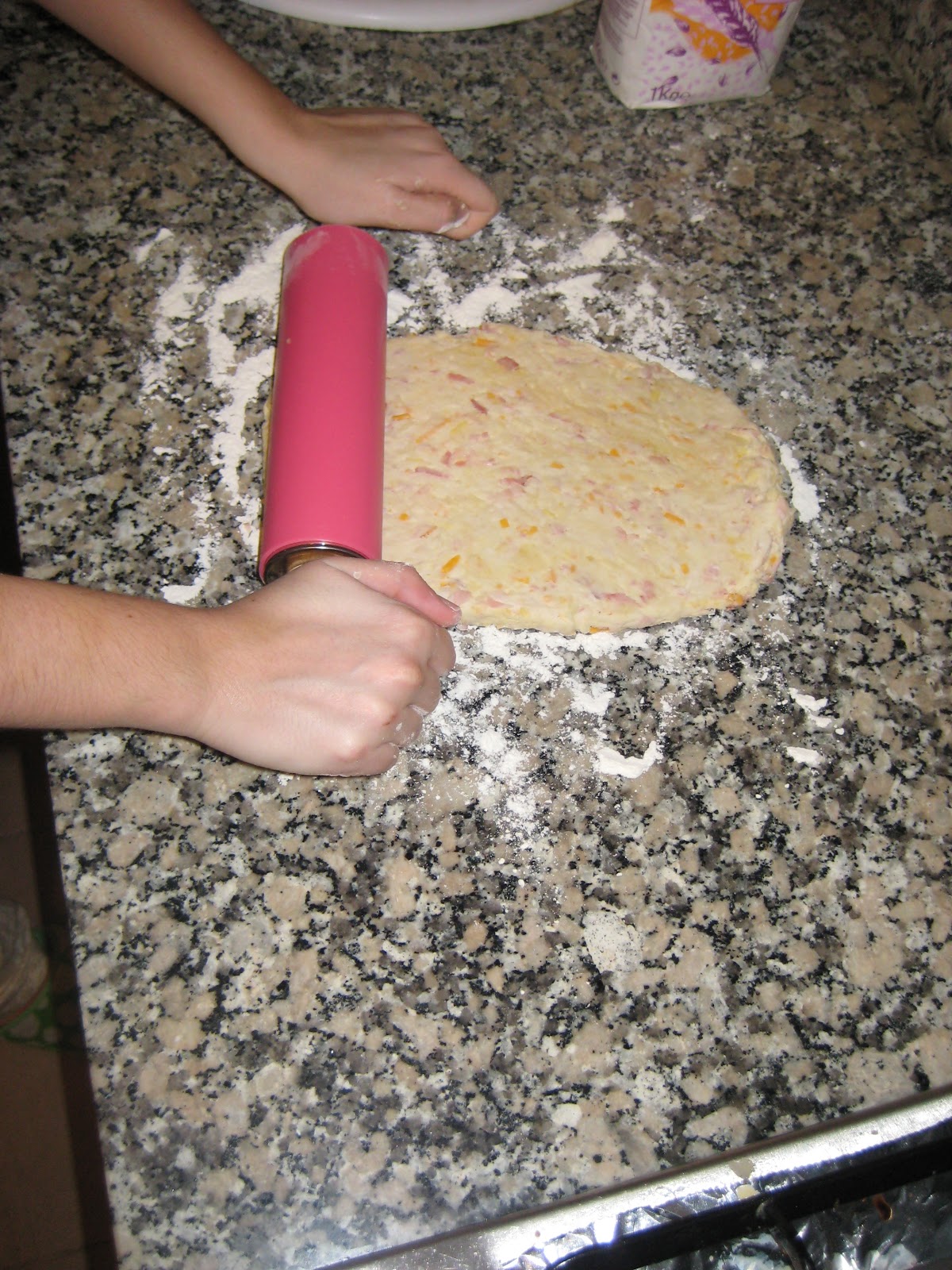 Enharinar una superficie limpia y después extender la masa con un rodillo hasta conseguir que tenga más o menos un centimetro de grosor.