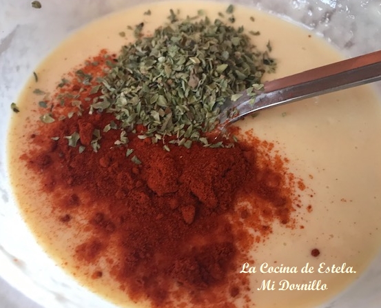 En un cuenco ponemos la harina con la levadura, mezclamos bien y añadimos agua poco a poco, para que se quede como una crema. Añadimos el huevo, un poquito de pimentón, el orégano y la sal.