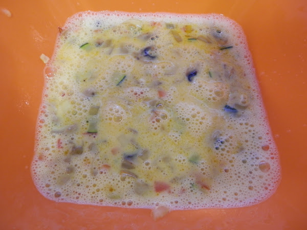 Cuando la verdura esté lista, la añadimos a la mezcla de huevo y leche. Removemos bien.