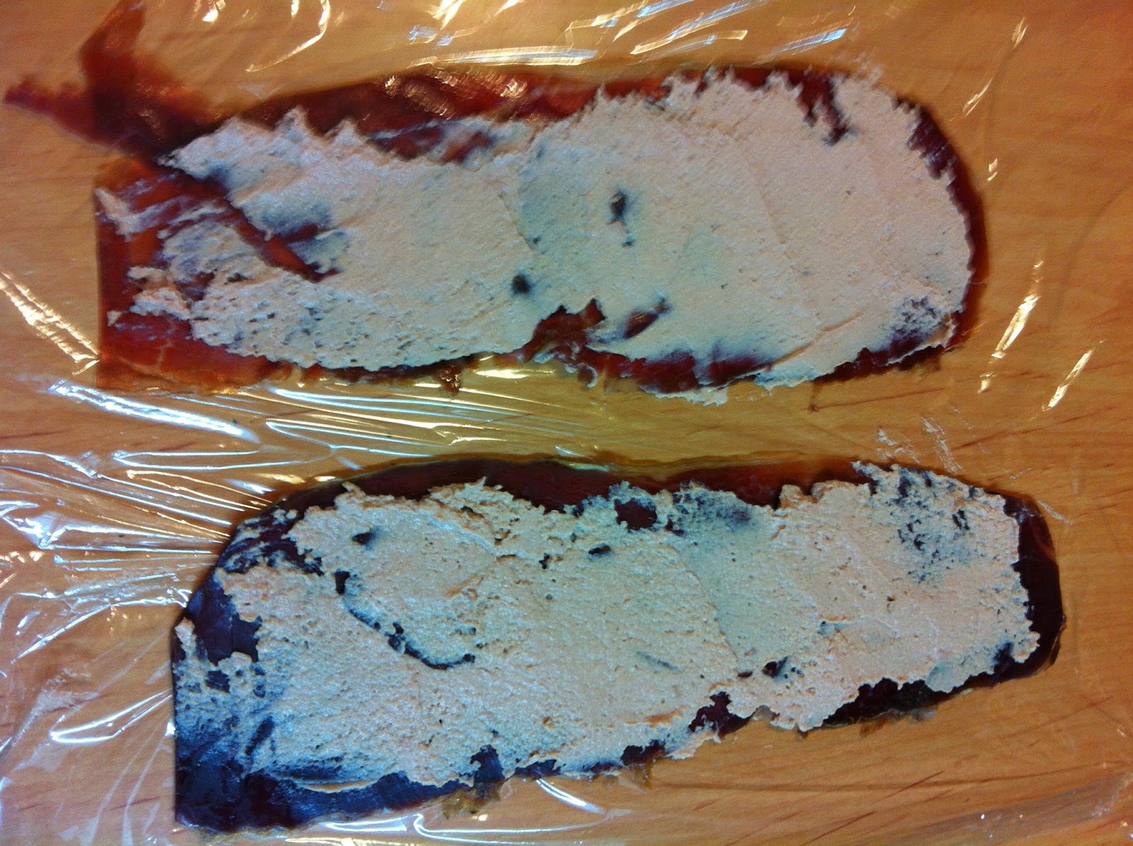 Se extiende cada loncha de cecina encima de un papel de plástico y se unta con el foie, de manera que no quede una capa muy gruesa.