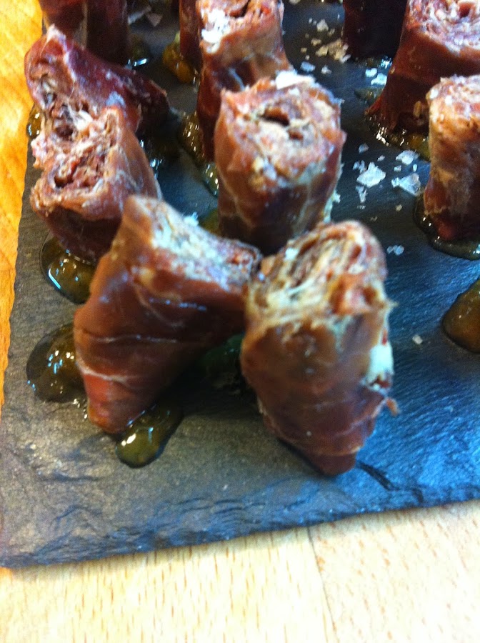 escamas de sal MaldonSe deja la cecina y el foie o paté fuera de la nevera durante un tiempo para que se pueda manipular mejor y envolver cada rollito.