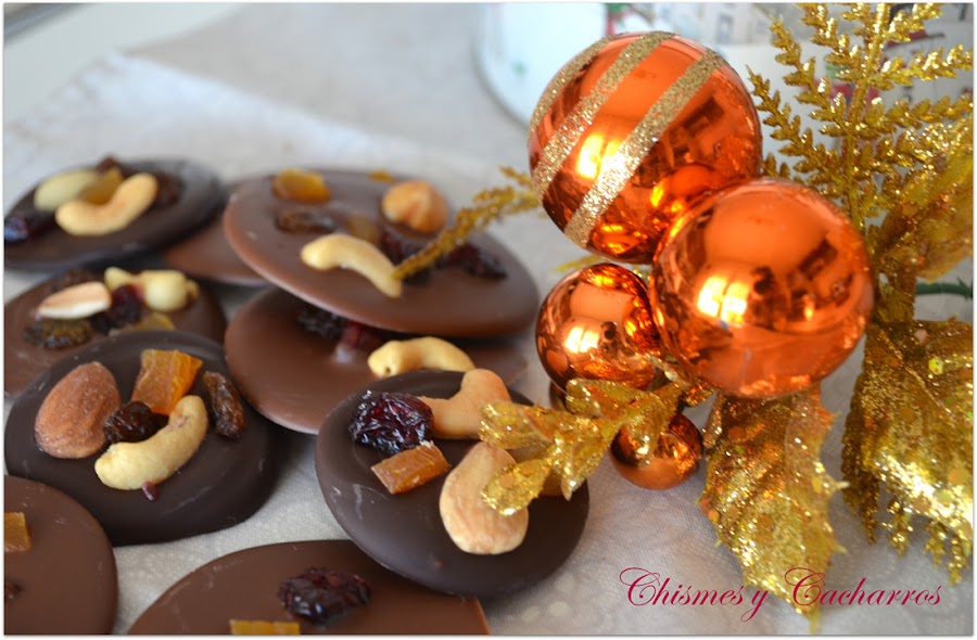 Colocar en una fuente de horno un papel de horno y hacer sobre el un círculo con cada uno de los chocolates. Colocar encima frutas y frutos secos al gusto. Meter en el frigo para que se endurezca en chocolate y listo. Guardar en latas y disfrutar.
