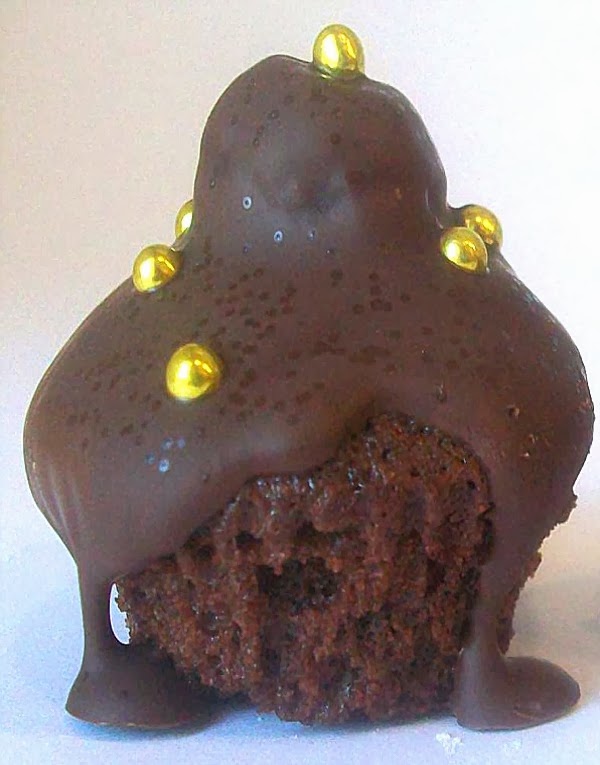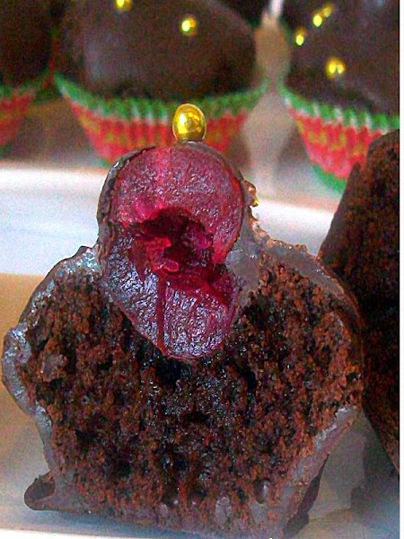 Deshacemos la tableta de chocolate al baño maría o microondas y se lo echamos por encima para que cubra la cereza y parte del pastelito. Esperamos un poco antes de sacar el palillo y poner la decoración.