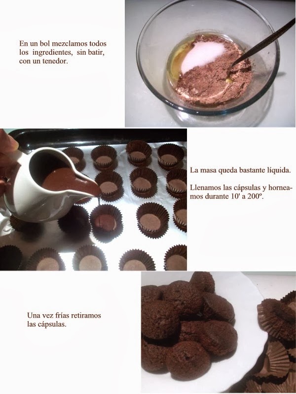 Llenamos los recipientes para minimagdalenas o trufas unos 2/3 y los introducimos en el horno a 200º durante 10". Podéis sacar un bollito a los 10" para ver si están hechos por dentro.