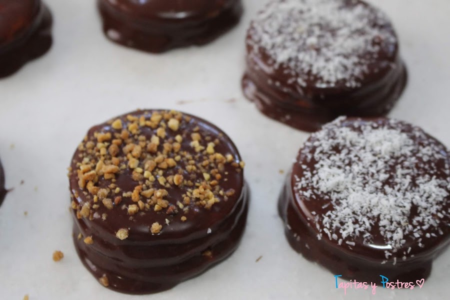 Los dejamos sobre papel vegetal hasta que el chocolate se seque un poco, aunque la cobertura no se pondrá dura del todo.