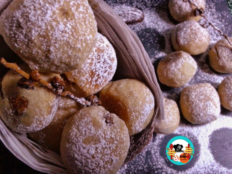 6.- Precalentamos el horno a 180º C. Colocamos los bocaditos en una fuente para horno, cubierta con papel sulfurizado. Horneamos 15 minutos. Las retiramos del horno Dejamos templar, espolvoreamos con azúcar glas.