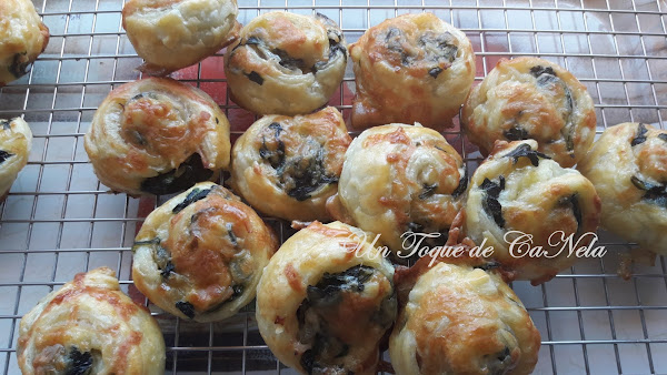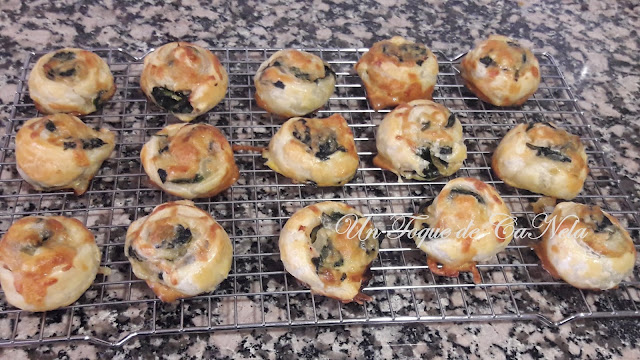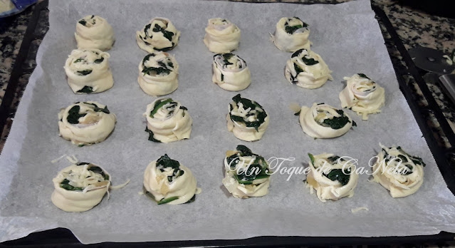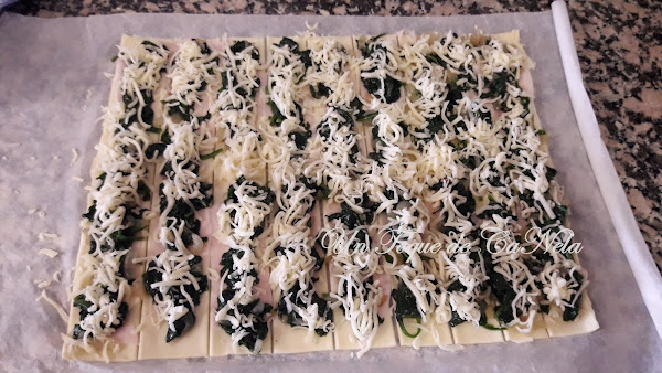 Poner las espinacas sobre las tiras de hojaldre y el queso.