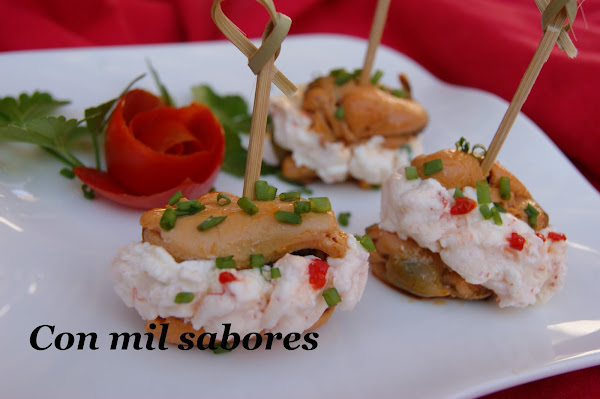 Para preparar la crema del relleno pondremos en un bol el queso crema, cortamos en trocitos muy menuditos el pimiento del piquillo y el cebollino y se lo añadimos al queso crema, lo aderezamos con un poco de Tabasco Chipotle, tanta cantidad como nos guste de intenso su sabor. Mezclamos todo los ingredientes muy bien y la introducimos en una manga pastelera con boquilla rizada. Para el monteje tomamos un mejillón, lo cubrimos con la crema que hemos preparado y lo cerramos con otro mejillón a modo de bocadito. Servir con un poco más de cebollino picado.Toda una delicia!.