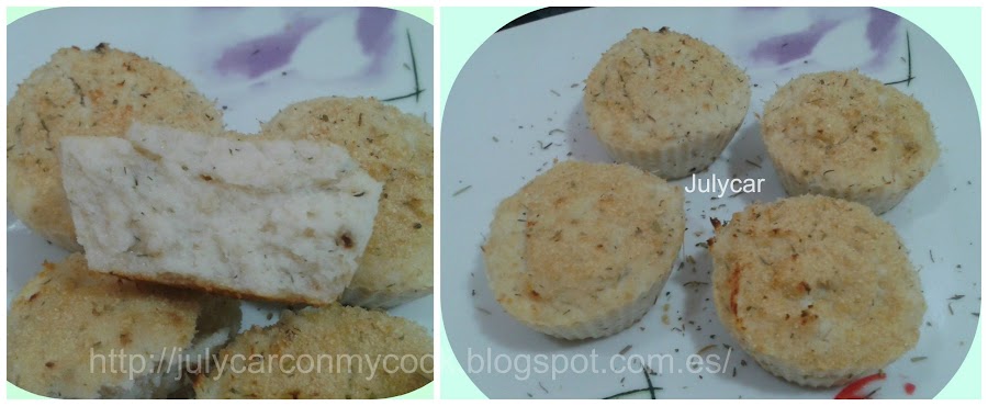 En un recipiente apto para microondas y que lleve para hacer al vapor, meter el pescado tapar y 4 minutos a 700w. Meter todos los ingredientes incluido el pescado en el vaso de la batidora y triturar, llenar los moldes de silicona 1º con un poco de pan rayado de milanesa de soja rellenar de la masa del pescado y por encima poner un poco de pan rayado de milanesa de soja, meter los moldes en la cocimix deluxe, menú horno 160º, 5 minutos y tapa doradora 250º, 8 minutos, trabajan las dos al mismo tiempo