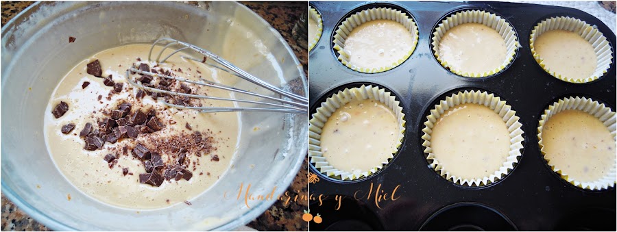 He echado el chocolate que me había sobrado y lo he unido a la mezcla, luego he rellenado los papeles de magdalenas y al horno junto a los bocaditos.