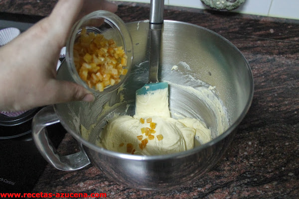 Ahora añadiremos la naranja confitada reservándonos un poco, con ayuda de una cuchara mezclaremos, no las mezclaremos con las varillas ya que las podríamos deshacer.