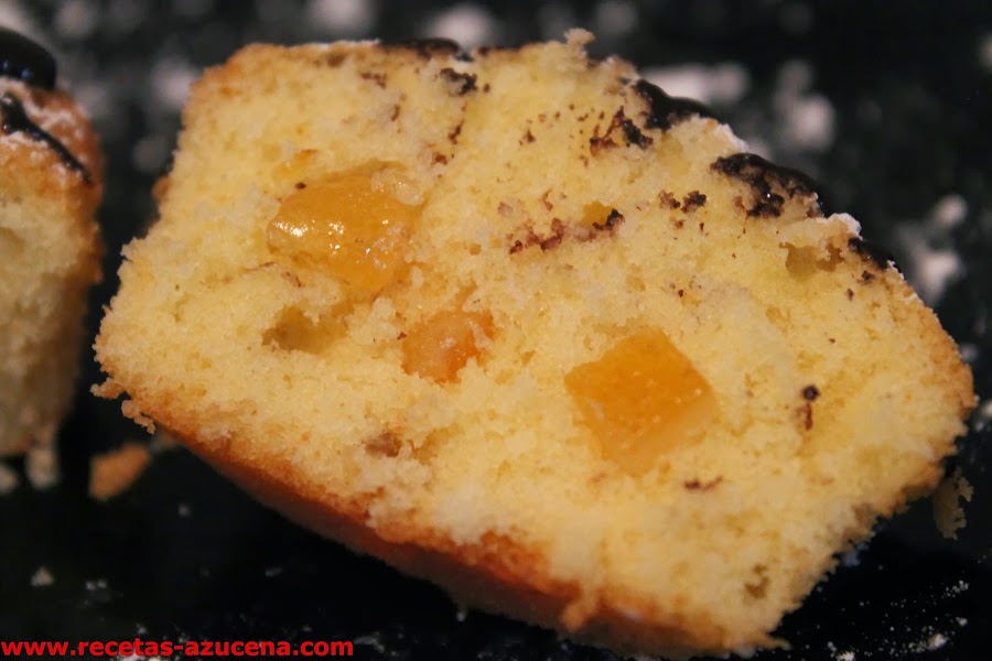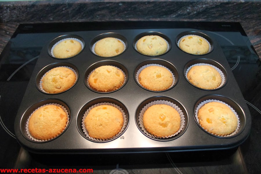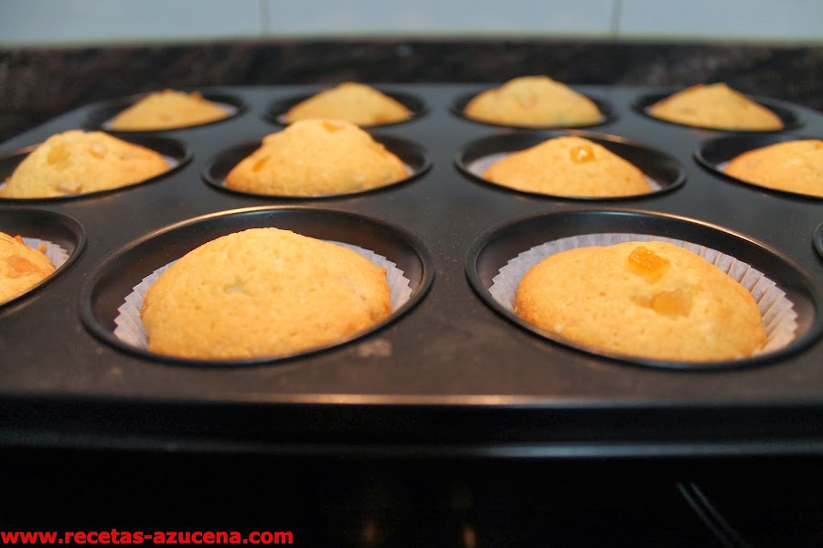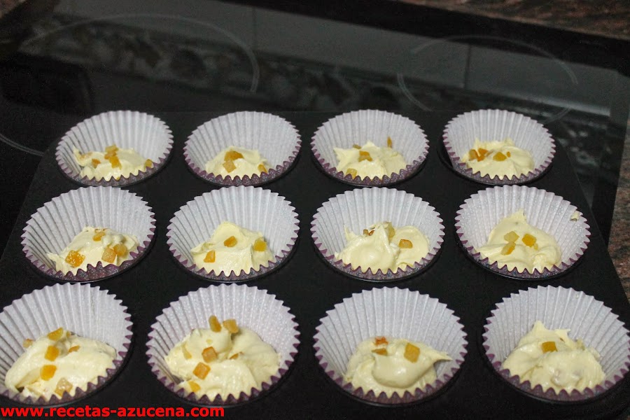 Una vez lista toda las masa con ayuda de un sacador de bolas de helado o con unas cucharas iremos rellenado las capsulas para que la más nos quede justo a la mitad o poco más de cada capsula, una vez tengamos rellenadas todas las capsulas le pondremos por encima unos trocitos de naranja confitada que teníamos reservados.