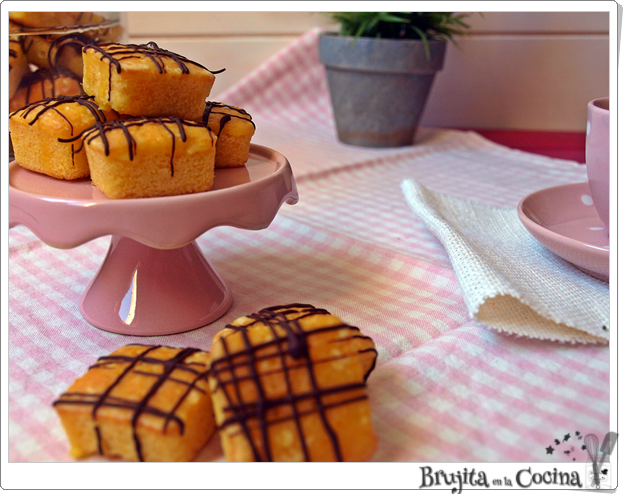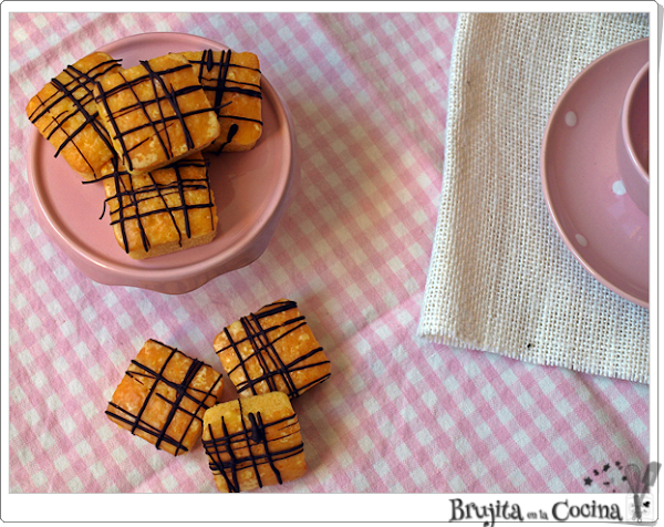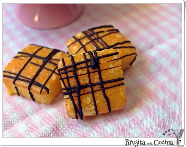 La mezcla de naranja con el toque del chocolate siempre queda bien, son como minibrownies ya que no llevan levadura, se hacen en un bol con una varilla o con cuchara, no necesitamos ni máquina ni batidora especial. Vamos aptos para cualquier persona por muy torpe que se sea, incluso si no se tiene el molde de minibrownies que he utilizado yo, usas uno cuadrado y luego a cortar. Si es que hoy lo pongo dulce y fácil.