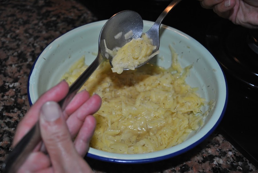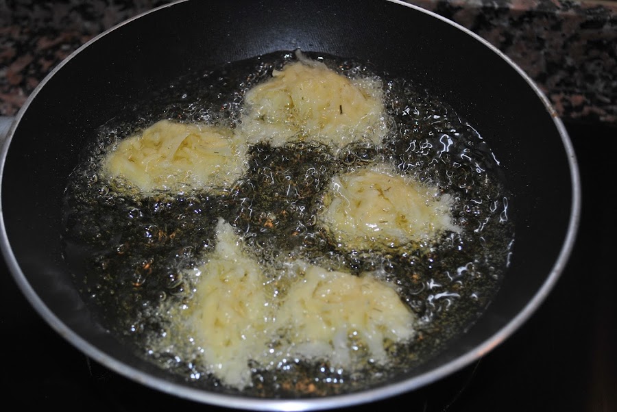 Con una cuchara cogeremos pequeñas porciones y las iremos echando con cuidado en la sartén.